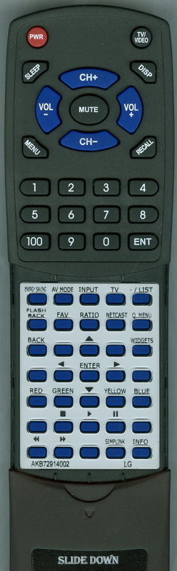 The RTAKB72914003 is a custom-built replacement remote control to the original LG AKB72914002. It will perform all the functions that the original LG remote did and only uses a different shell.