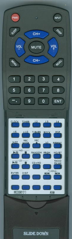 The RT86CD0951010 is a custom-built replacement remote control to the original AIWA CSDMD5. It will perform all the functions that the original AIWA remote did and only uses a different shell.